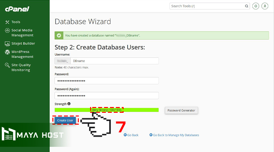 - پس از انتخاب پسورد یوزر دیتابیس و نام یوزر بر روی دکمه Create User کلیک کنید.